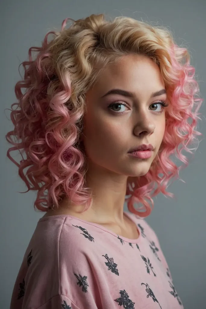 Your curls can shine with a mix of blonde and pink tones. Add soft pink highlights to light blonde hair and style it into bouncy curls.