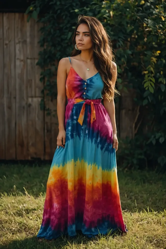 Channel summer vibes in a tie-dye maxi dress. The flowing silhouette keeps you cool while making a statement.