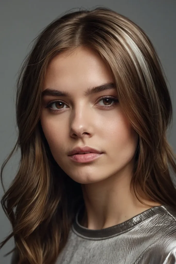 Brown hair with silver highlights creates a stunning mix of warm and cool tones.