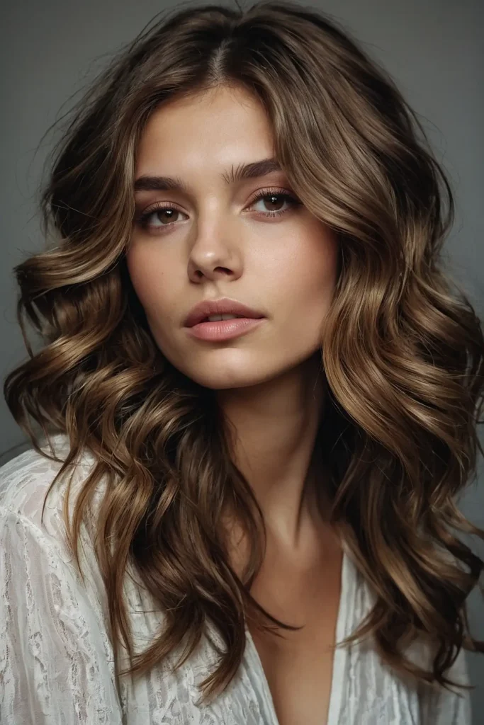 Layered brown waves with silver highlights create a stunning blend of warm and cool tones.