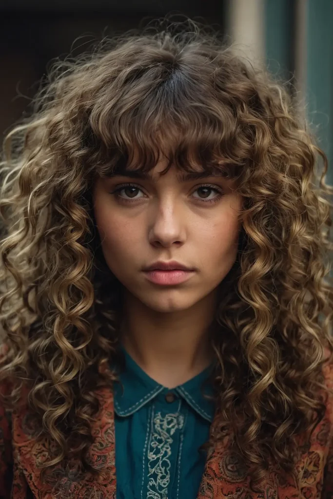 The combination of curls and bangs creates a fun, youthful look that’s easy to style and maintain.
