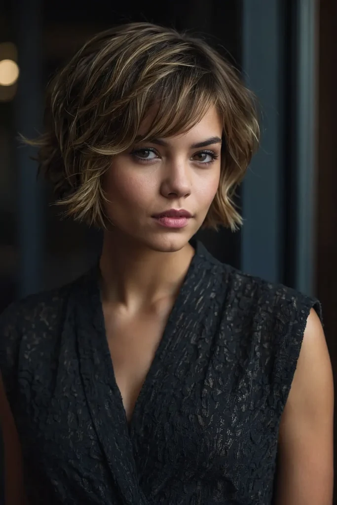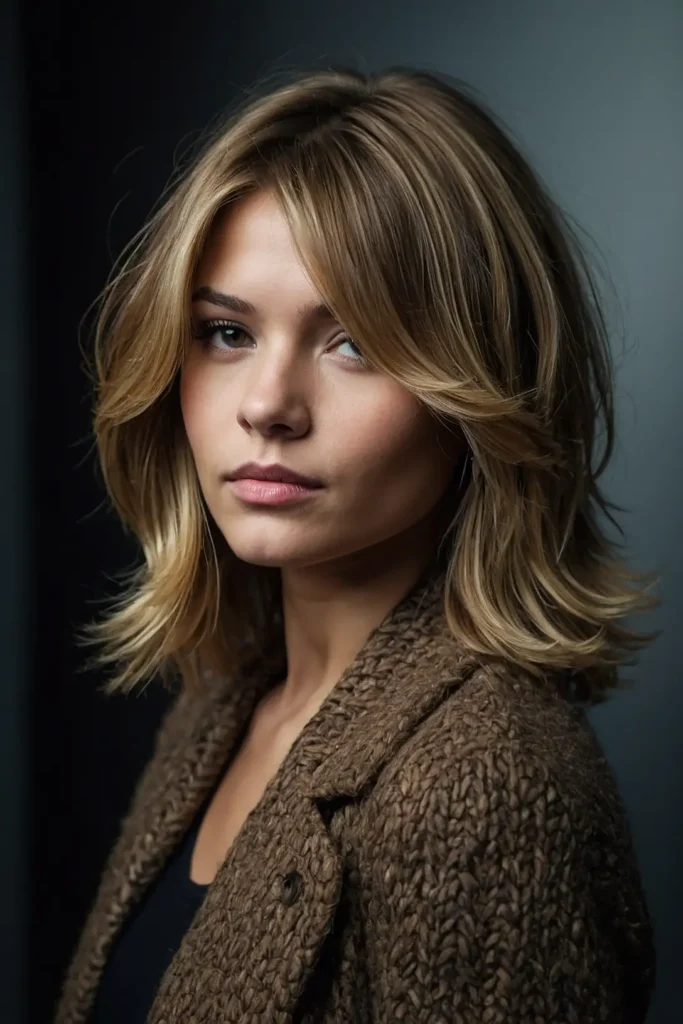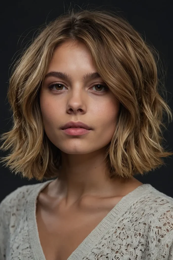 A shoulder-length bronde bob with tousled layers creates an effortless, modern look. The mix of brown and blonde tones adds depth while keeping the style natural.