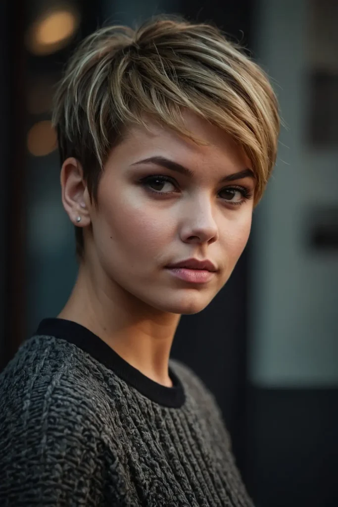 A dark blonde pixie cut with lighter tips creates a bold yet natural look. The short layers frame your face while bright highlights add dimension to the ends.