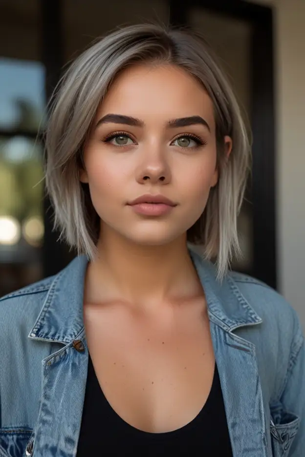 A side-shaved ash bob combines edgy style with cool, silvery tones.