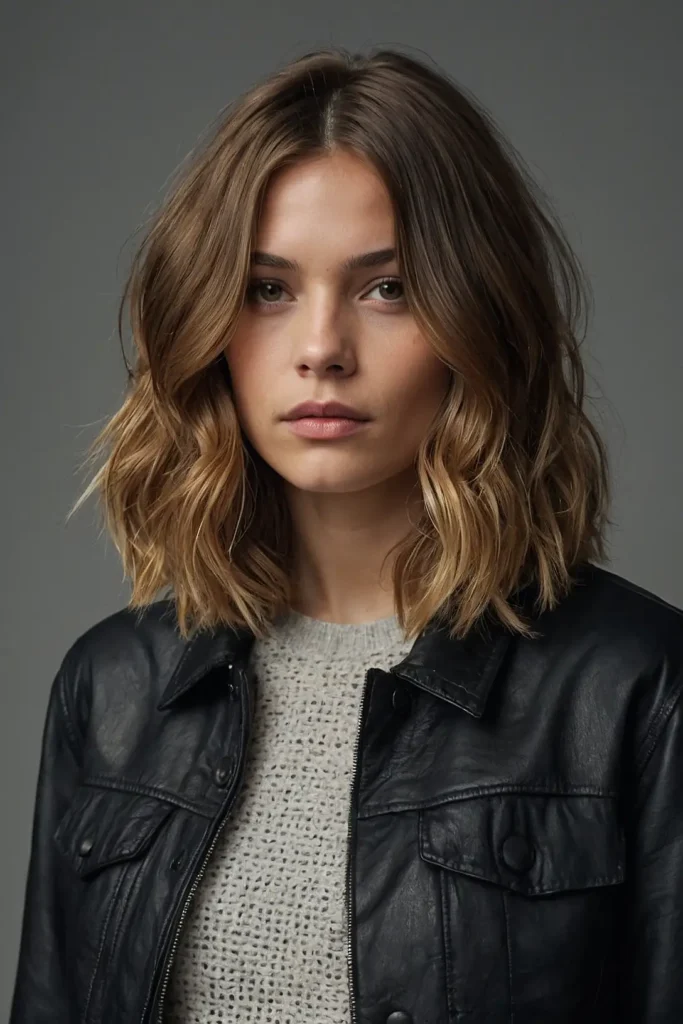 A layered lob with soft waves hits just above your shoulders and adds movement to your hair. This cut works great for all hair types and face shapes.