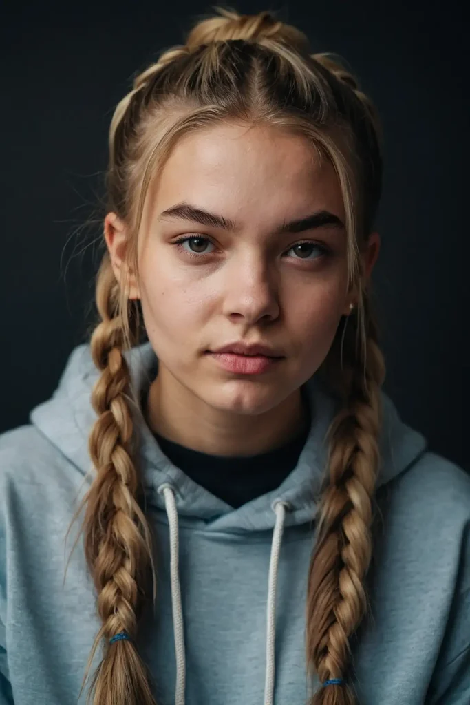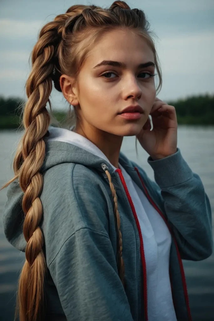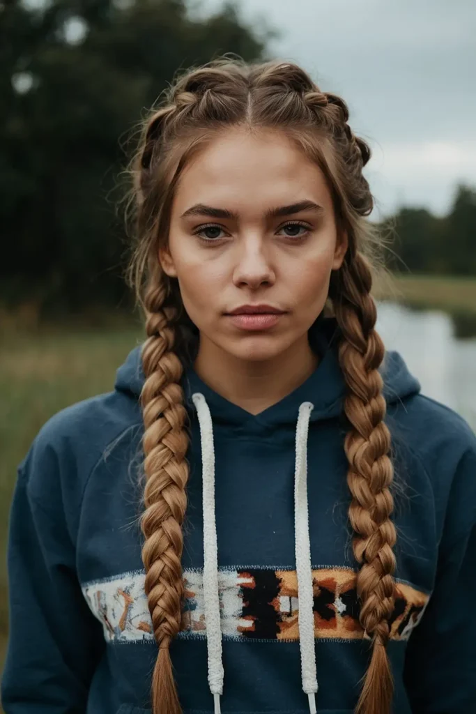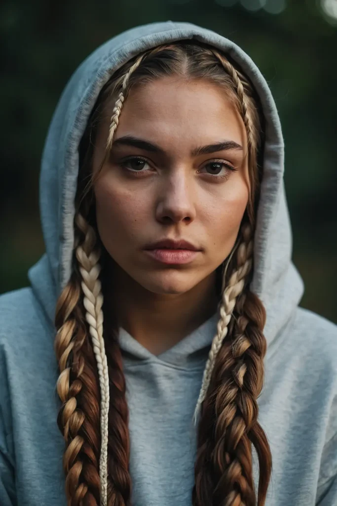 This style suits medium to long hair best. Pin your braids securely to keep them in place while wearing your hoodie.