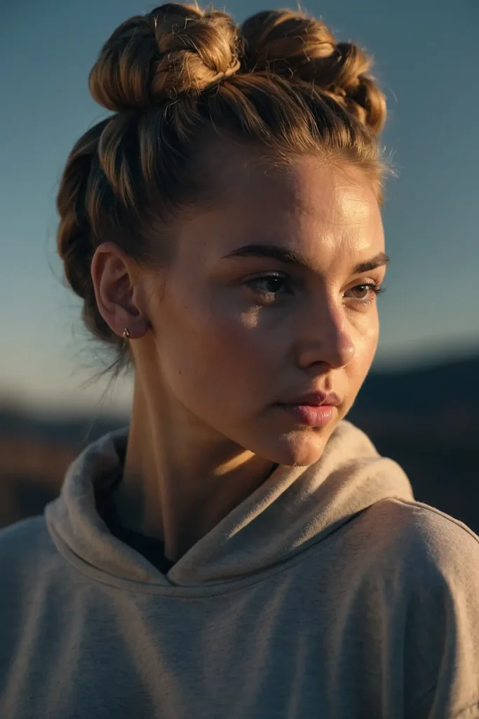 This style looks great with both straight and wavy hair. Your hoodie will frame the buns nicely while keeping you cozy and stylish.
