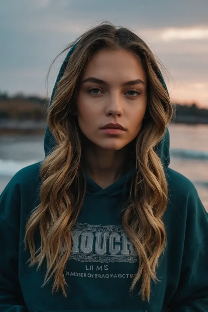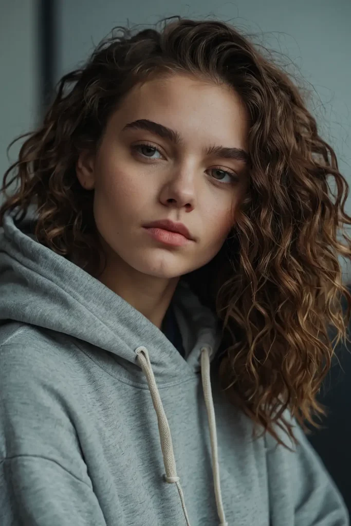 Create soft, textured curls with a curling wand for a laid-back look under your hoodie. The loose waves add volume and movement while keeping your style casual and effortless.
