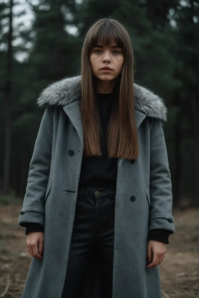 The bangs start at the center of your forehead and sweep outward, while the rest of your hair features the signature wolf cut layers.