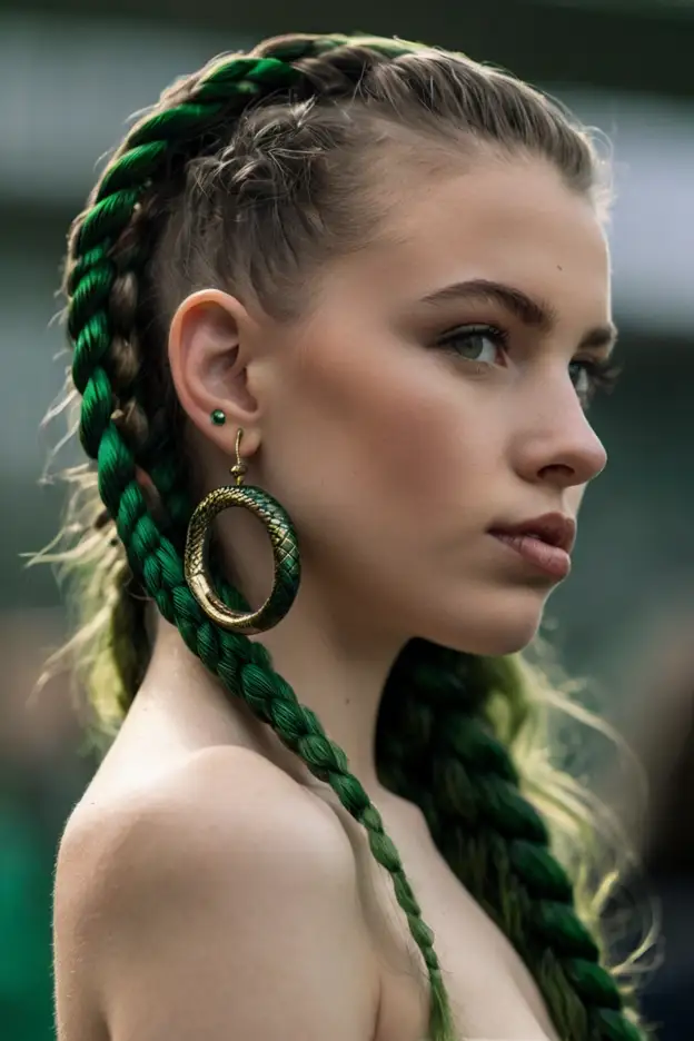 Create two long braided pigtails that twist and curve like serpents. Secure each braid with clear elastic bands, then shape them into S-curves on each side of your head.