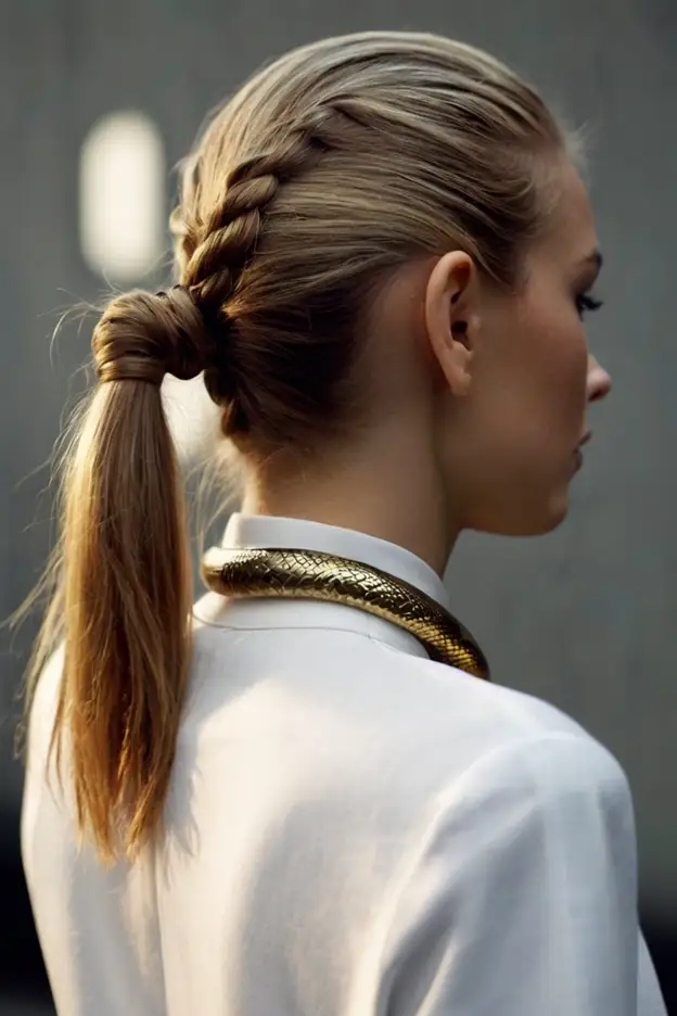Pull your hair into a sleek low ponytail at the nape of your neck. Secure it with a hair tie that matches your hair color.