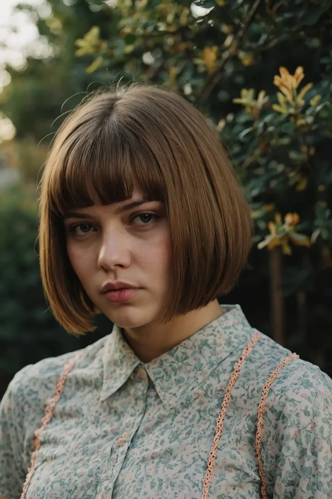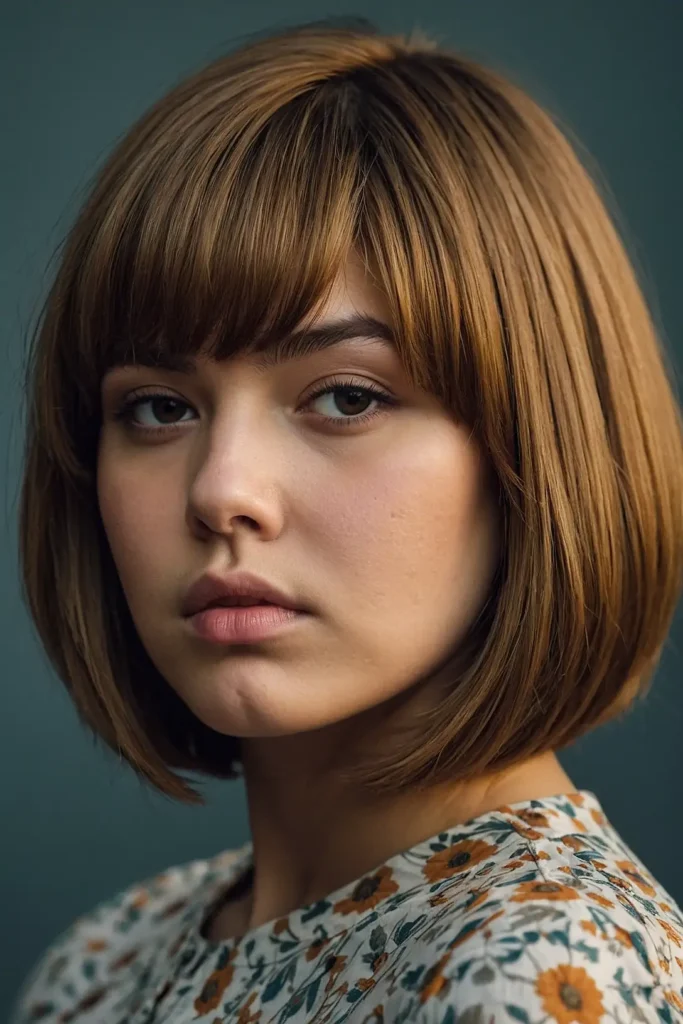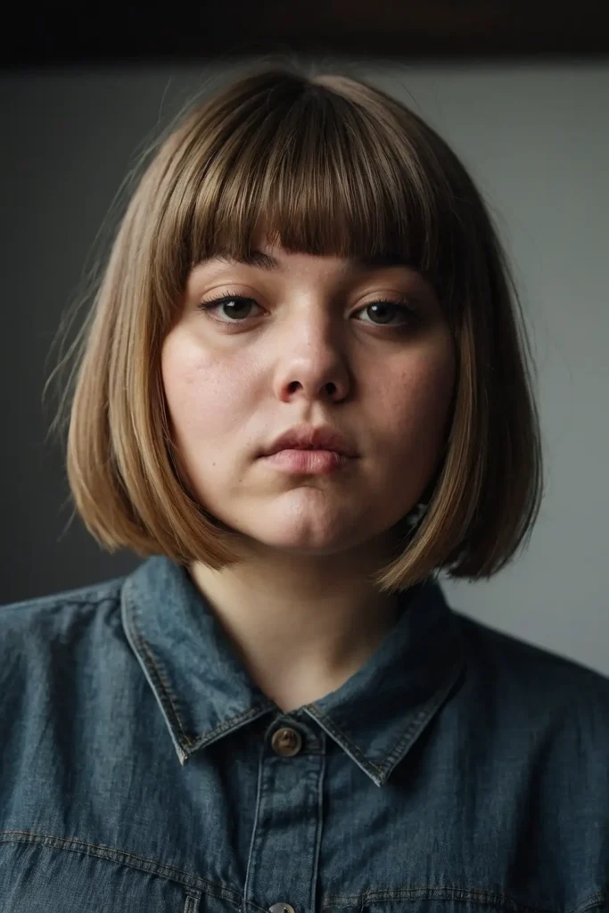 A short blunt cut ends right at your chin with clean, straight lines. This style creates a strong frame around your face and adds structure to your features.