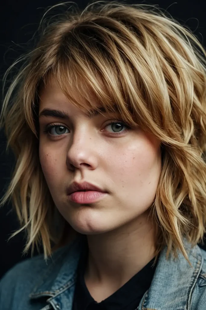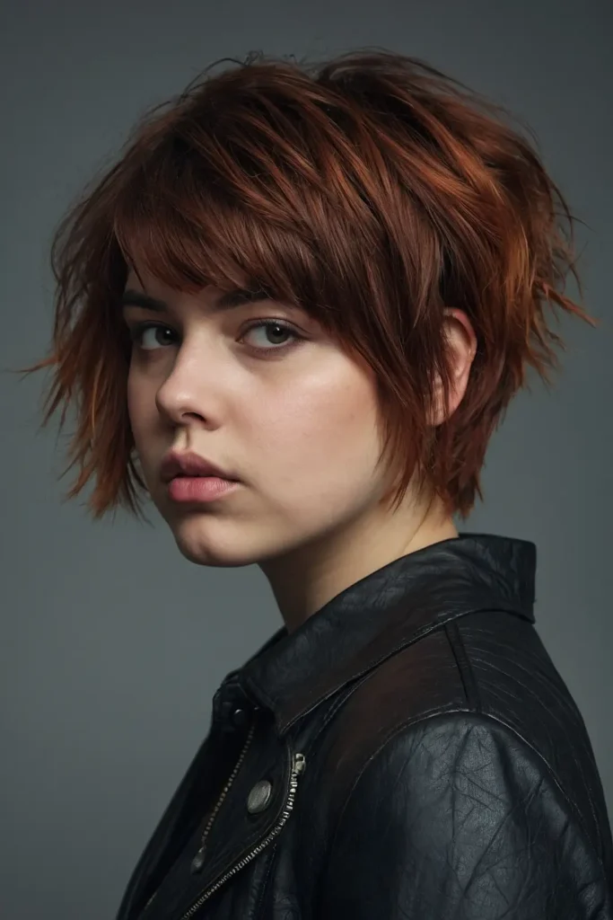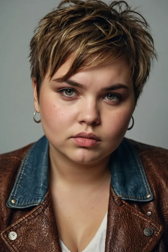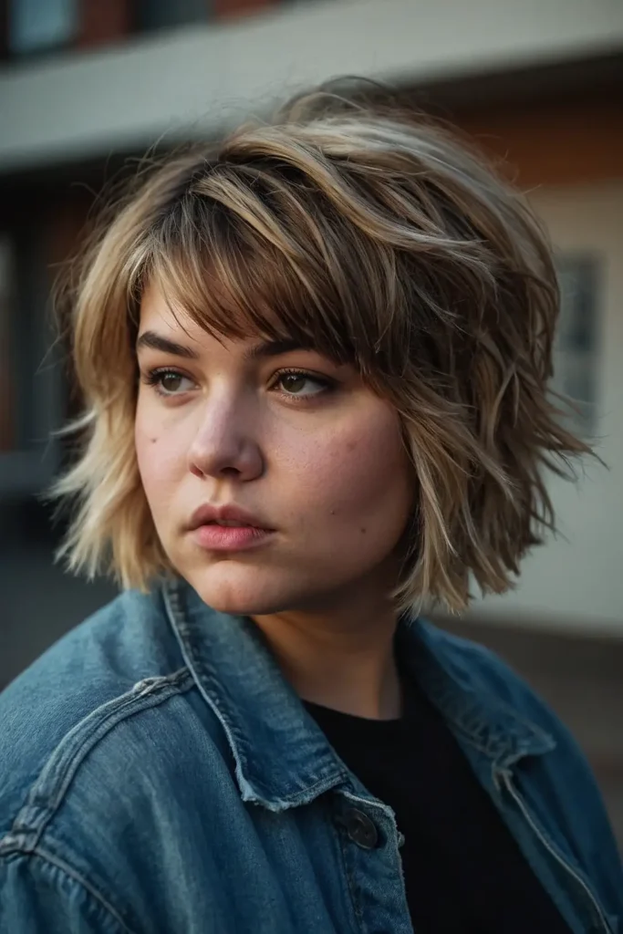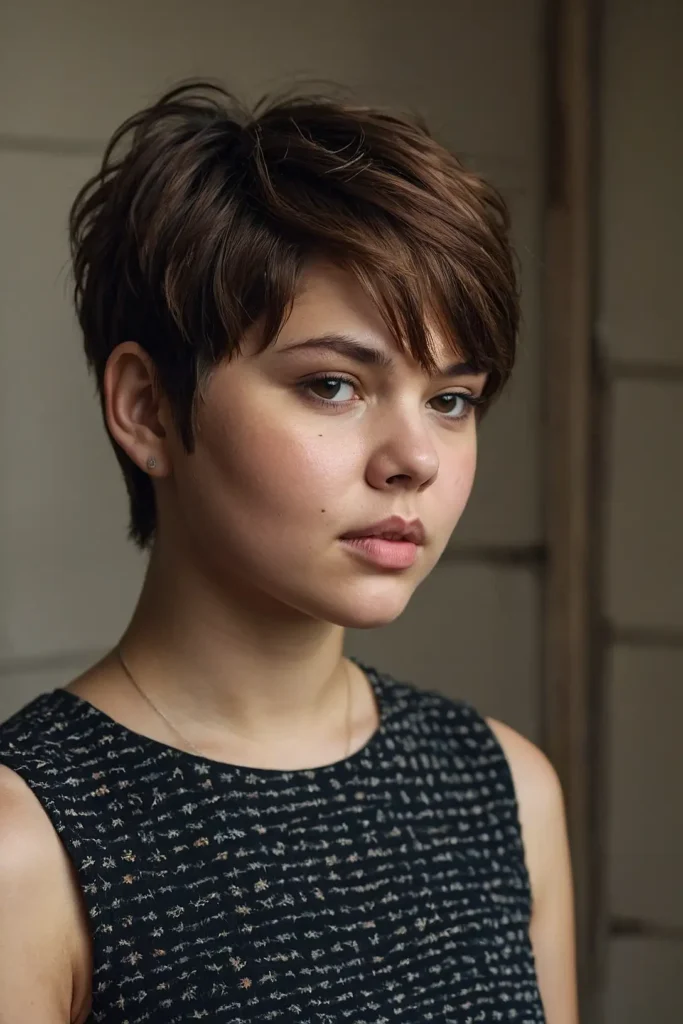 The textured short shag adds life to your chubby face with its choppy, tousled layers. The cut creates natural volume at the crown while framing your features.