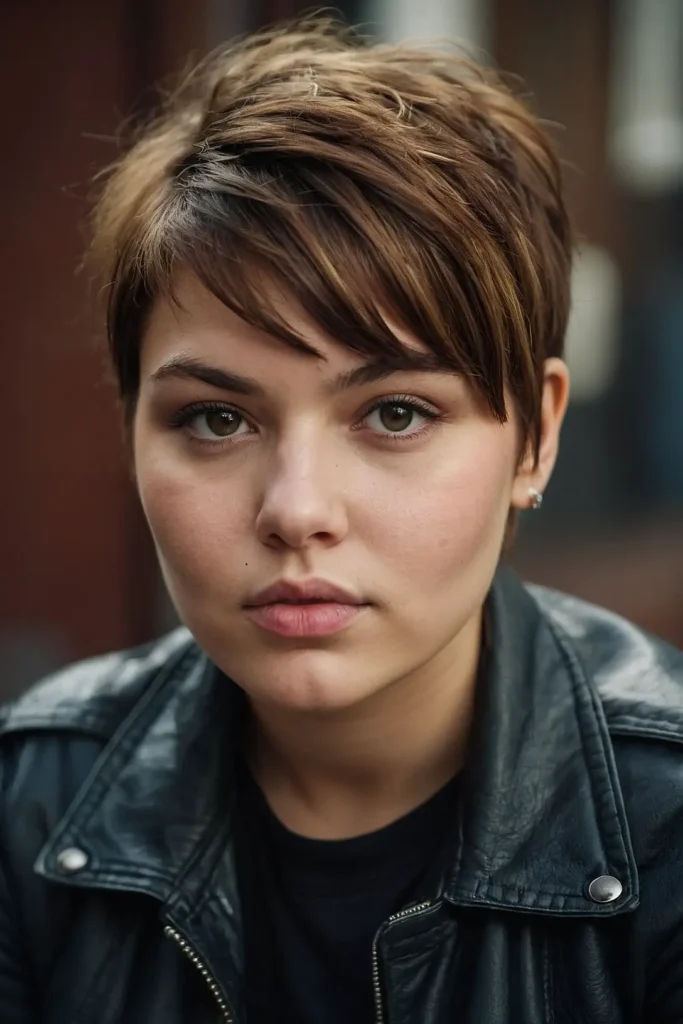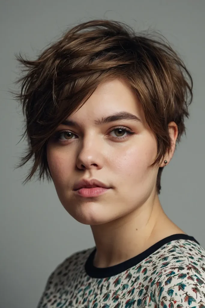 A pixie cut with long side bangs creates a flattering look for round or full faces. The short back and sides slim your face shape, while longer bangs soften your features.