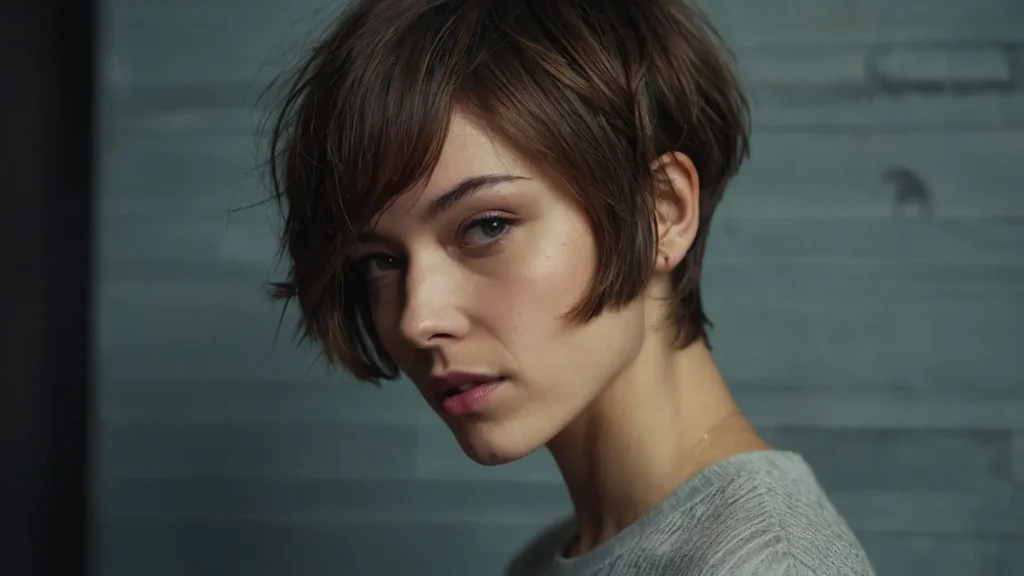 A choppy pixie with bangs adds volume to thin hair and makes it look fuller. The textured layers create movement and dimension.