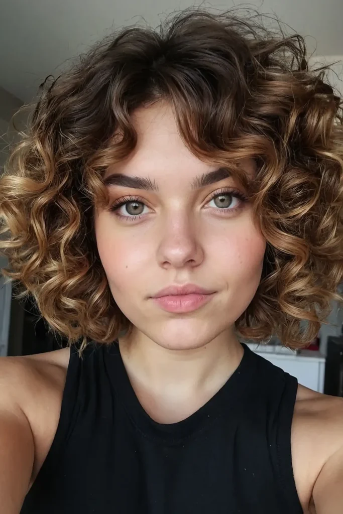 A curly bob with volume creates a slimming effect for your round face. The curls stack near your crown to add height, while soft layers frame your cheeks.