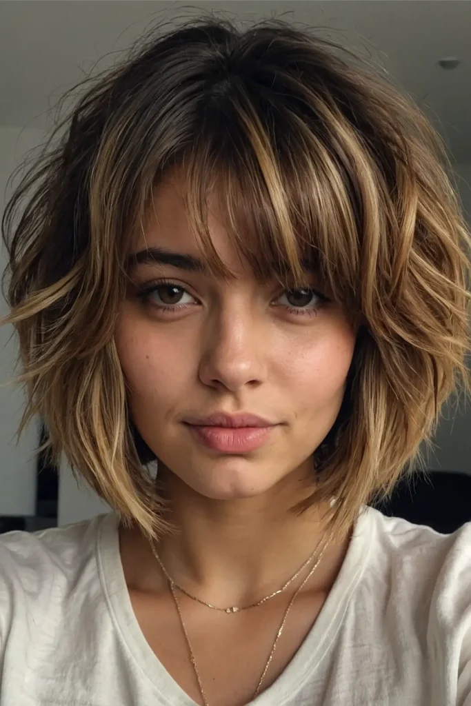A short shaggy bob with choppy layers creates a slimming effect on round faces. The textured cut hits just above your shoulders while the shaggy pieces break up fullness around your cheeks.