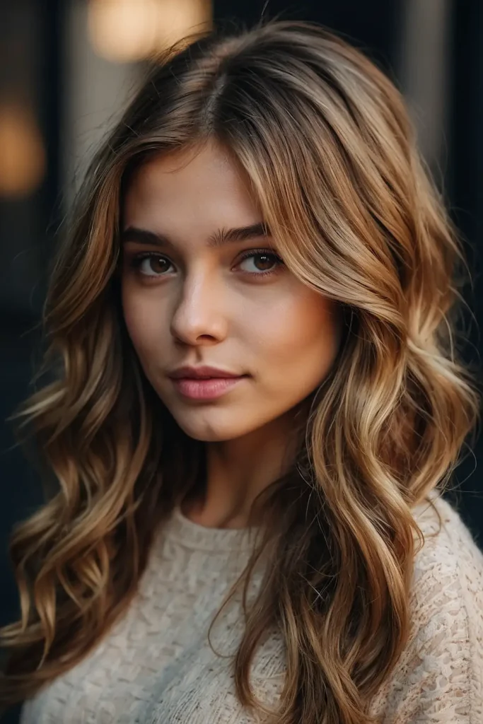 A mix of golden and sandy brown highlights brings out the waves’ texture. This style works well on medium to long hair lengths.