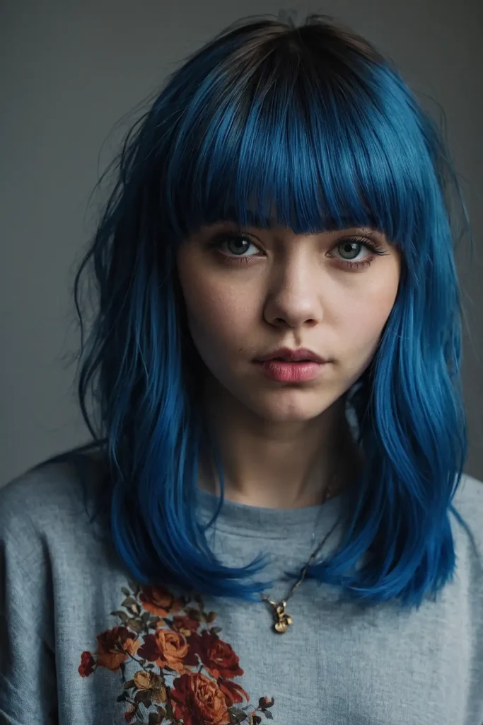 You can pair the blue bangs with dark hair for maximum impact, or blend them into blue highlights throughout your layers.